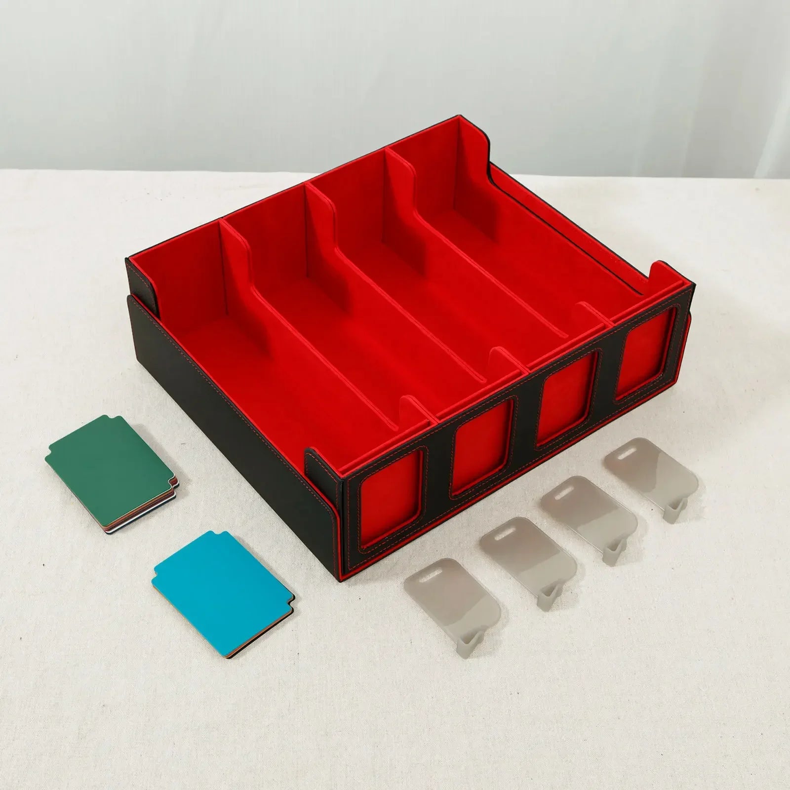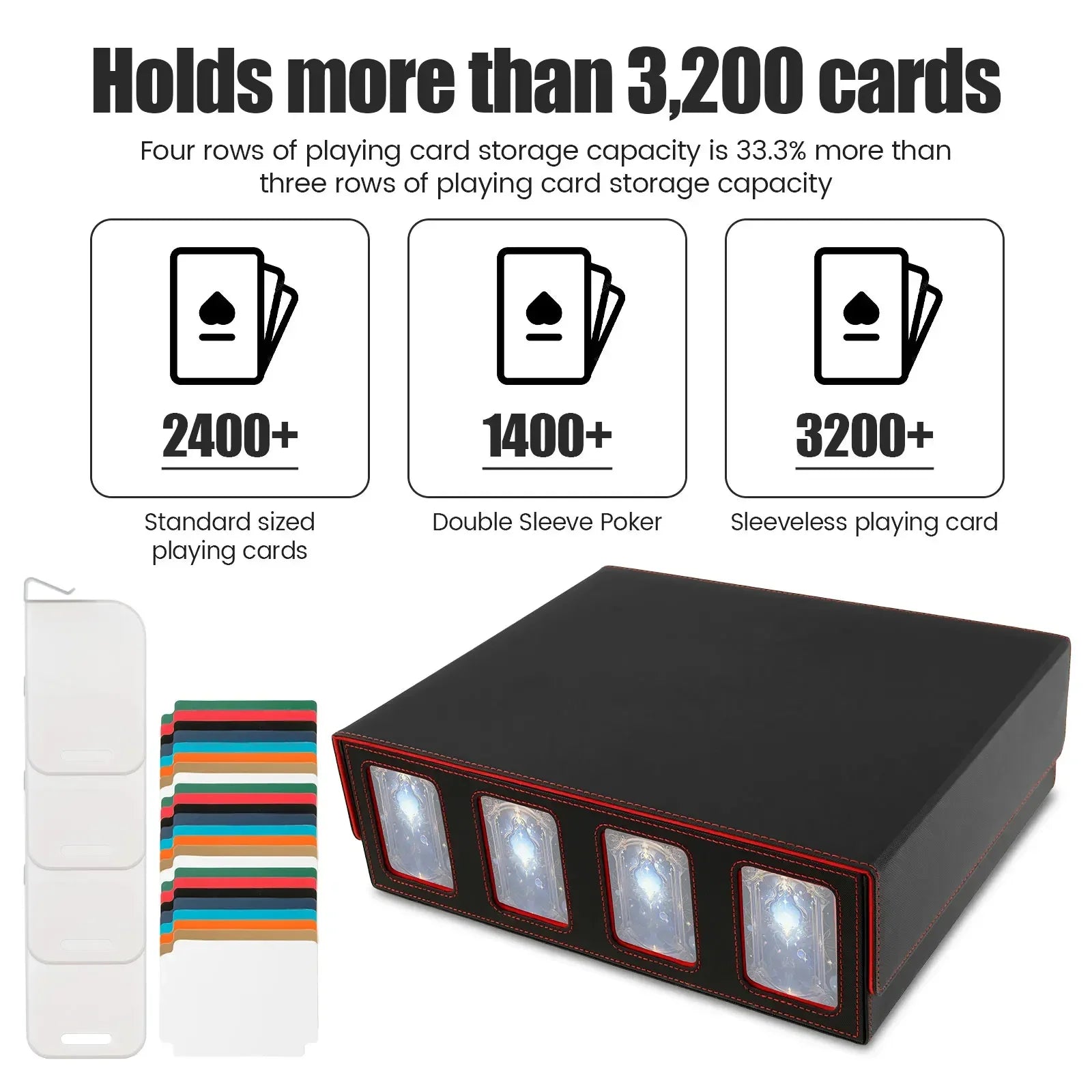 4 Rows: The card organizer is designed with 4 rows, which increases the storage capacity by 33.3% compared to three rows of cards box. It is large enough to hold over 2,400 standard cards or 1,400 double-sleeved cards or 3,200 sleeveless cards.